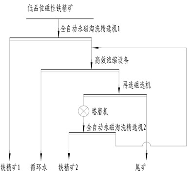 1.2、閉路。全自動永磁淘洗精選機精礦作為最終精礦產(chǎn)品,溢流尾礦中部分低品位連生體經(jīng)濃縮磁選機處理后,作為中礦再磨再選,進一步有效回收利用其中的有用礦物。